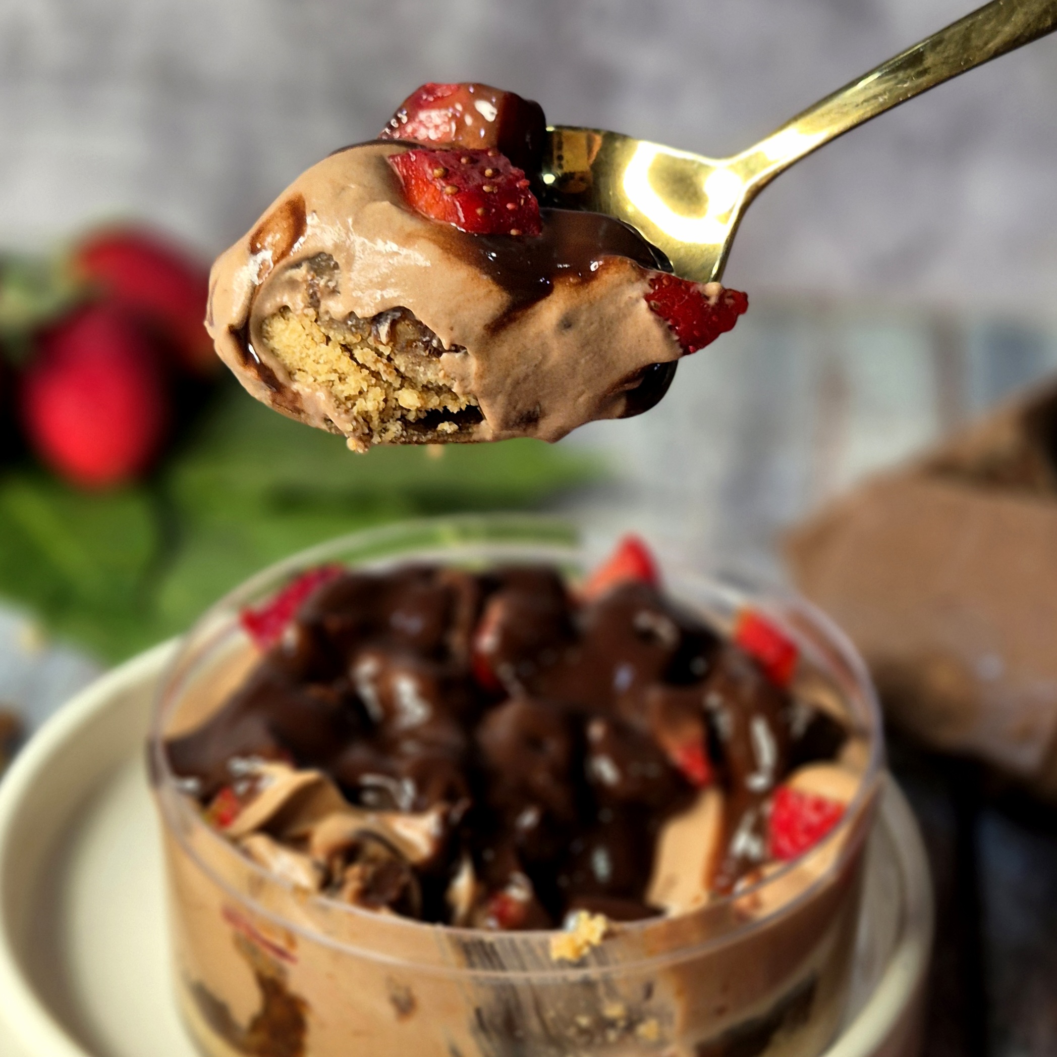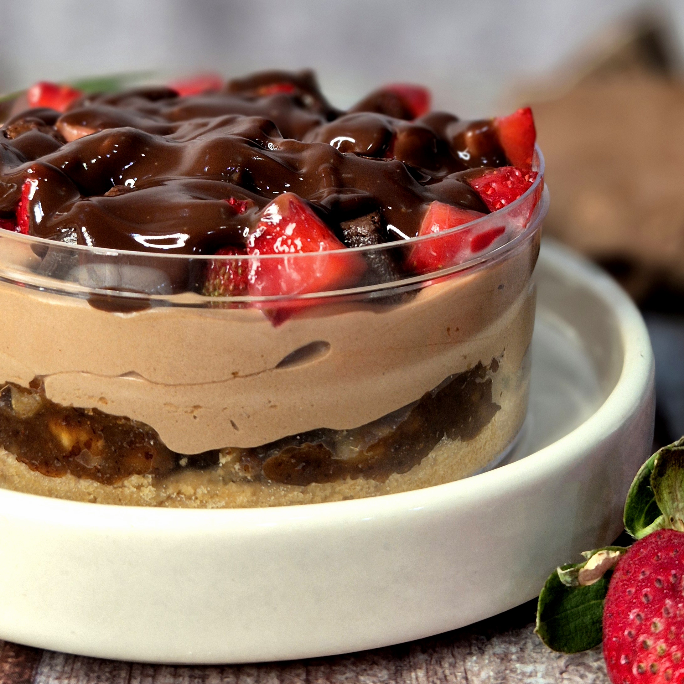 A festive layered delight with crunchy biscuits, rich walnuts, silky chocolate mousse, fudgy brownie bits, fresh strawberries, and generous melted chocolate on top.